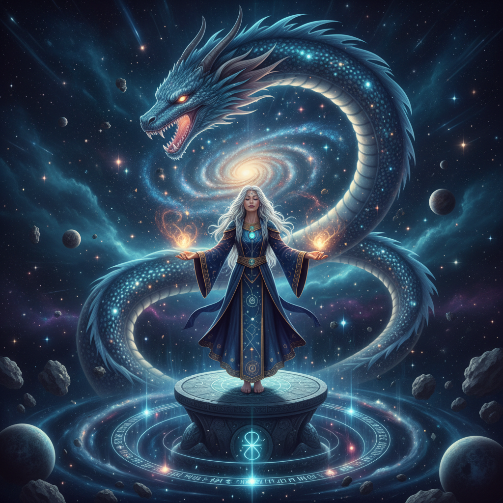 【指示文】スピリチュアルな占い師 宇宙をバックに龍神様とつながる壮大なイメージ