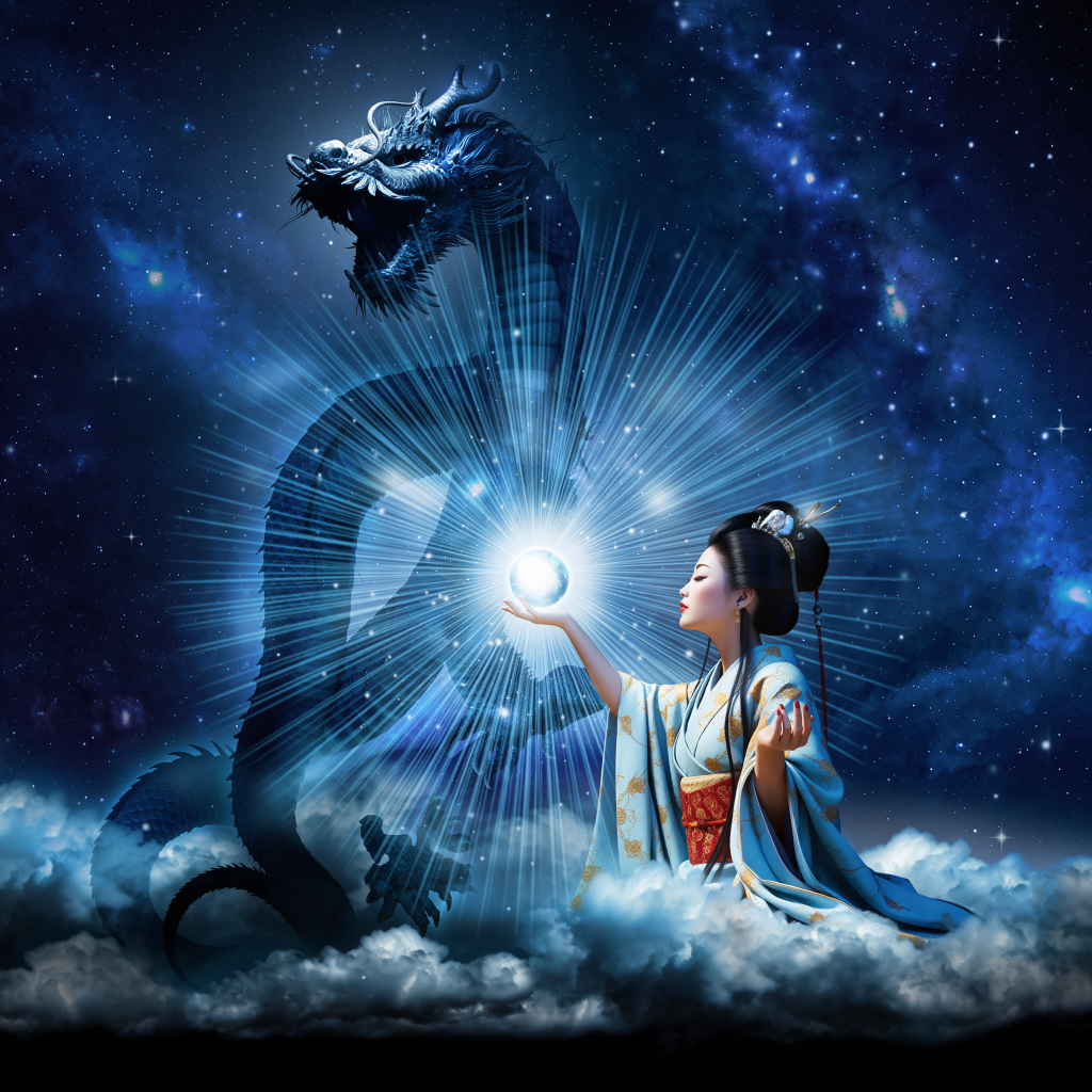 【指示文】スピリチュアルな占い師 宇宙をバックに龍神様とつながる壮大なイメージ それぞれに動きを付けて