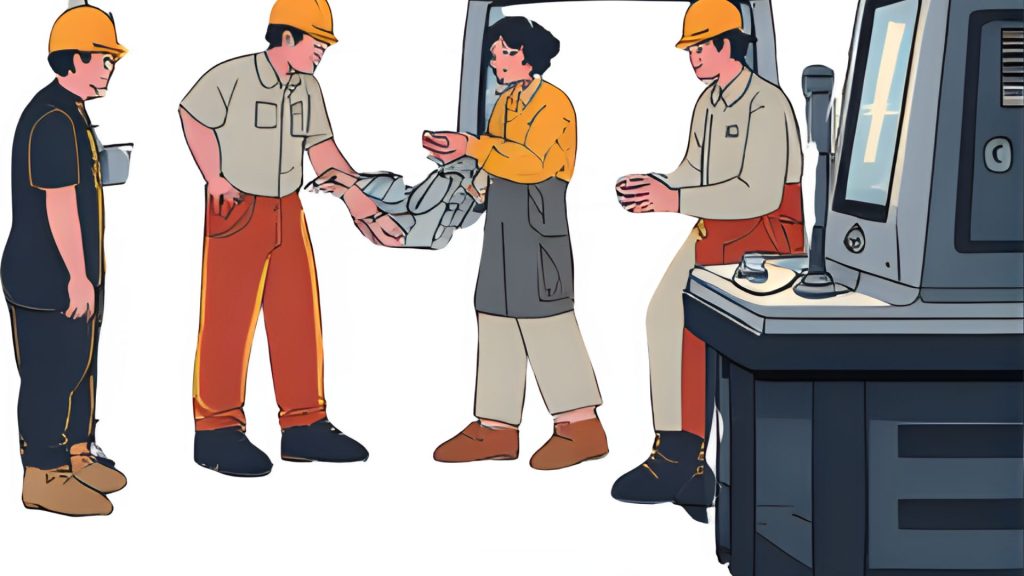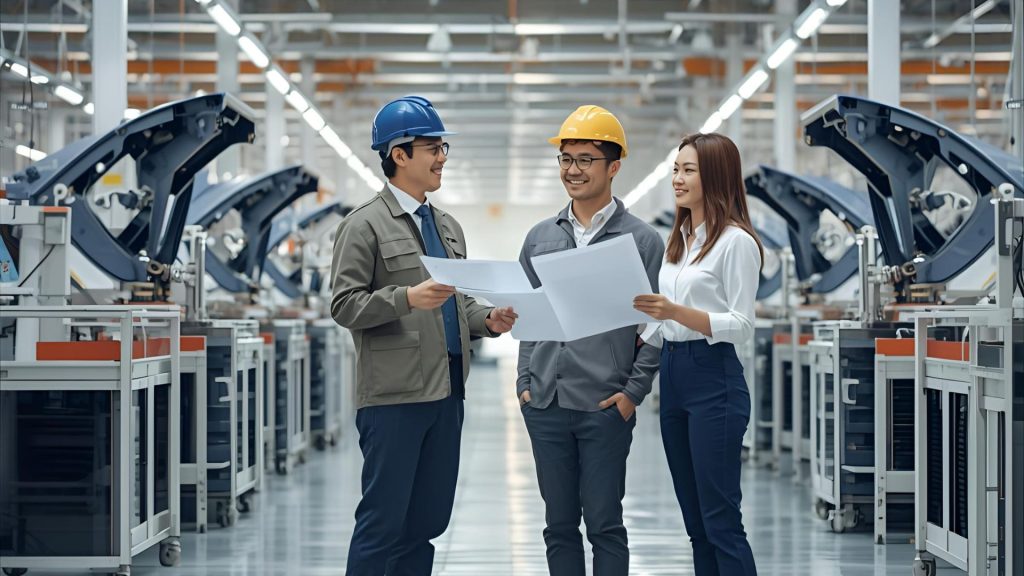 プロンプト(命令文): 「清潔で明るい日本の自動車部品工場の内観、最新の機械、20代の日本人男性と女性の従業員が笑顔で図面を見ながら相談している、作業着、ヘルメット、安全靴、朝の光、4k、高画質、写真のようなリアルなスタイル」