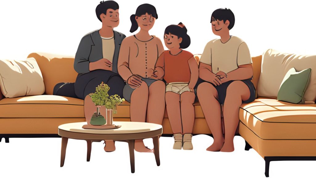 プロンプト(命令文): 「広々とした北欧風のモダンなリビングルーム、大きな窓、明るいフローリング、観葉植物、ソファでくつろぐ幸せそうな30代の日本人家族、温かい照明、インテリア雑誌のスタイル」
